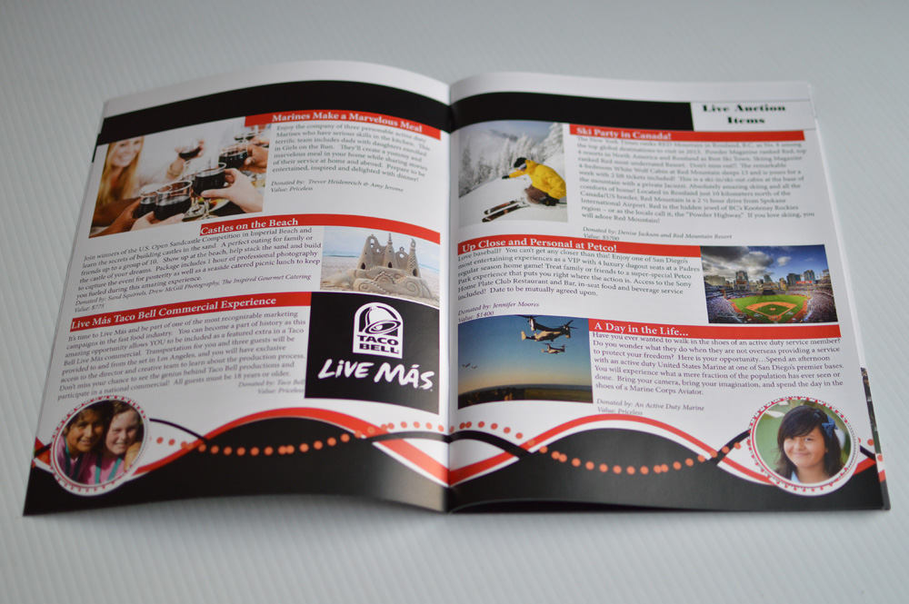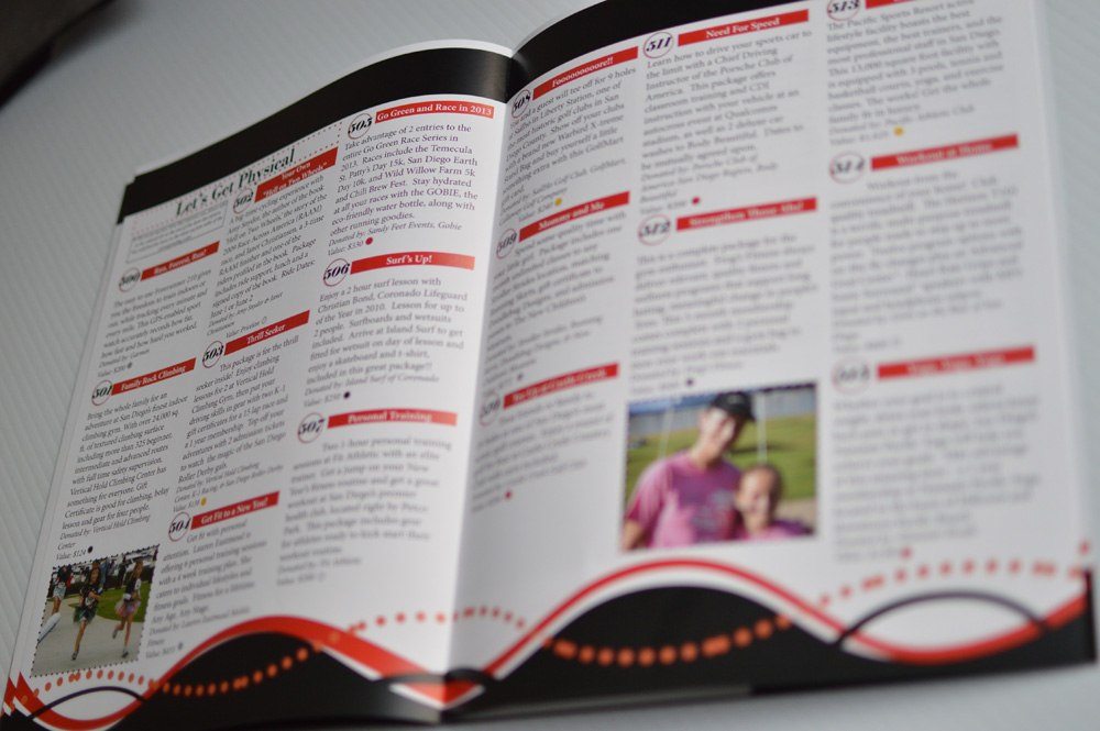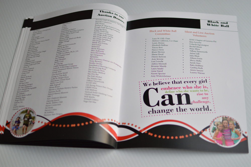 We had a week to design and a week to print it, and the content, items to be auction, was changing every second, which added to the challenge. They said the accents at the ball would be red, so I decided to incorporate that black-white-red color scheme into the program.